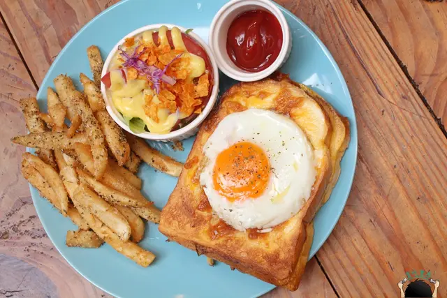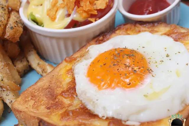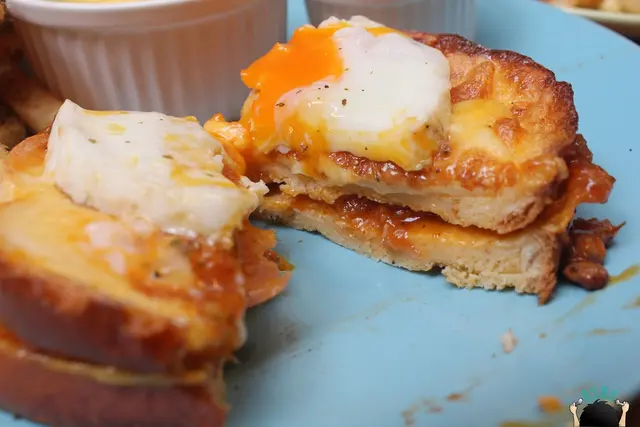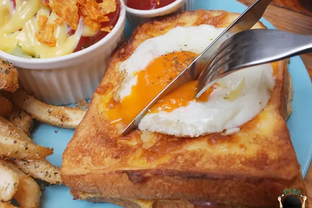 流出的蛋黃沒辦法包覆住整個焗土司的外衣。