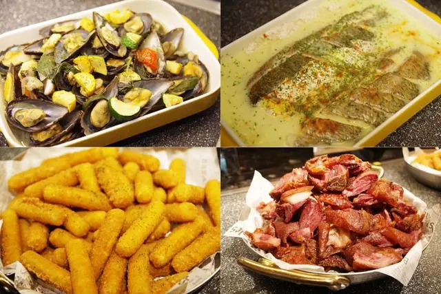 櫛瓜淡菜、奶油燴魚片、起司條、德國豬腳