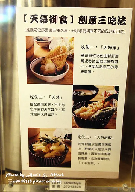 吃法1.天婦羅佐蘿蔔泥後沾醬吃吃法2.搭配白飯,把天婦羅鋪在飯上,再淋上天丼醬吃法3.盛白飯加上海苔&哇沙米,澆淋主廚秘製高湯變成天茶泡飯