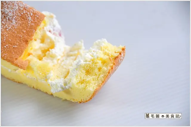 金黃色的戚風蛋糕體、雪白的鮮奶油、加上隱身其中的紅豔草莓,