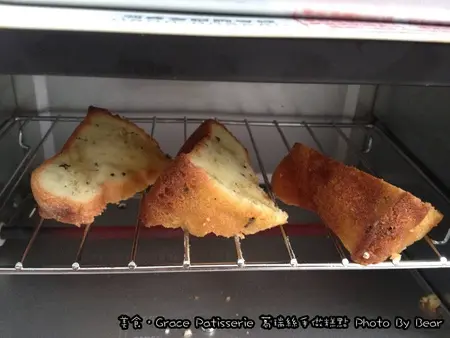 而烤過後,蛋糕變的鬆軟,外皮也因烤過而變的有點兒酥酥的
