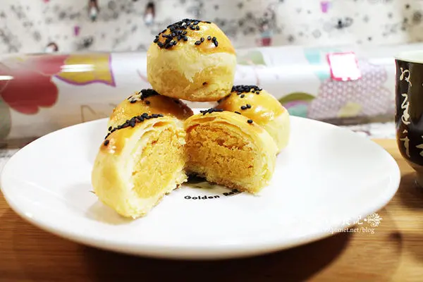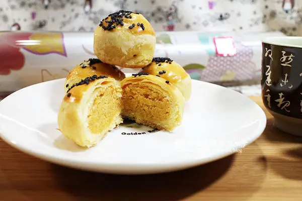 純正港式配方,師承香港師傅的製作技法,咬下去時,外皮金黃酥脆的外皮,便有濃濃的"奶香'及"蛋香",完全需要師傅的純練技術及功夫,外皮微烤的不焦黃,火侯的拿捏適當,因此烤得酥脆又不失原味,一口咬下,最令我驚奇的是內餡的軟綿順口,最重要的是他不會甜膩膩口,反而是淡淡的奶黃香氣及鹹蛋黃的濃郁感綜和掉了甜膩,而取代的是淡淡的奶黃餡及些許的椰漿香氣,為了迎合國人期望的健康標準,我想他在甜度上有遞減,所以吃的每一口均是真材實料的口感,及清爽無負擔的口感,而滑潤順口的內餡,也是師傅們精心研製的成果,可謂是品味糕點的上乘之選