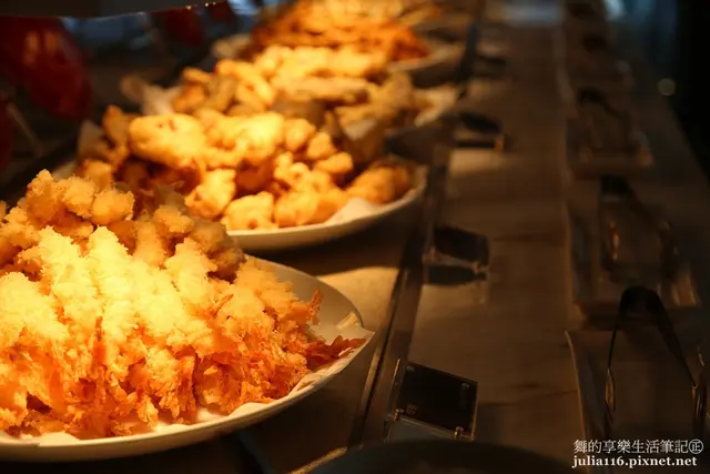 一整排炸物看上去十分誘人可口,有炸蝦、炸時蔬、烤魚、筊白筍...等等
