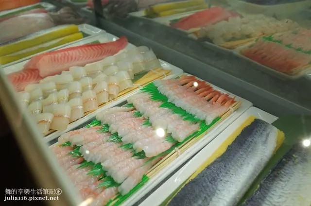 接著看到生魚片壽司區,每天新鮮提供來自日本的7種生魚片,每一種都好新鮮!另有手捲與握壽司喔!