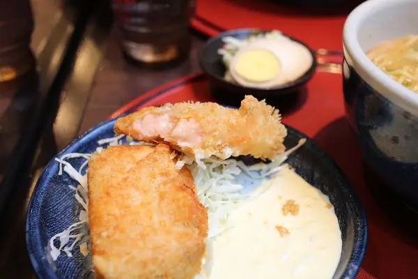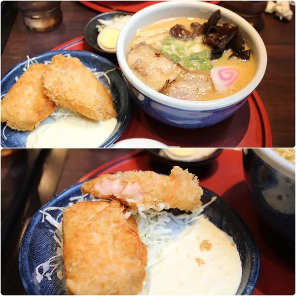 ↓我的辣味增叉燒拉麵&炸鮭魚組合,竟然附半顆茶葉蛋不知道什麼意思