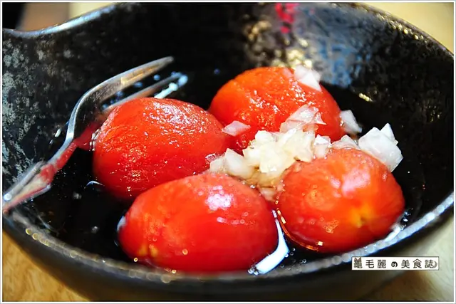去皮小蕃茄泡在醬汁裡,上面有加洋蔥和芹菜,吃起來酸酸甜甜很開胃。