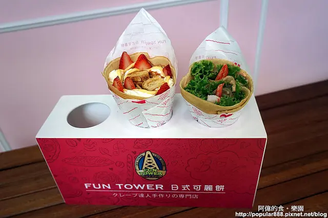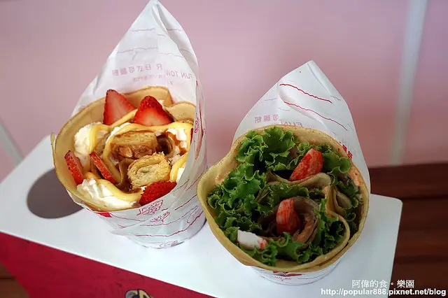 登愣!兩份日式可麗餅作好了,一甜一鹹放在特製的架子上。