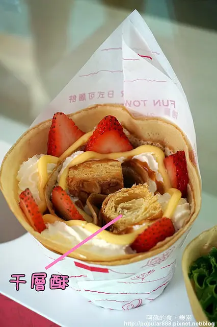 先看看甜的,裡面儲了滿滿的奶油,還有為數不少的草莓,再加上對半的"千層酥",一整個相當飽滿豐富!