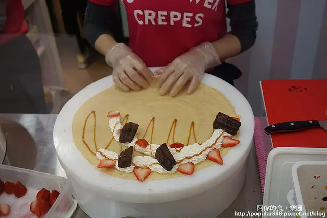 剛好這時有位客人點了一份"草莓焦糖可麗露"(145元),阿偉就趁機拍一下師傅製作的過程,放了兩顆可麗露在餅皮上。