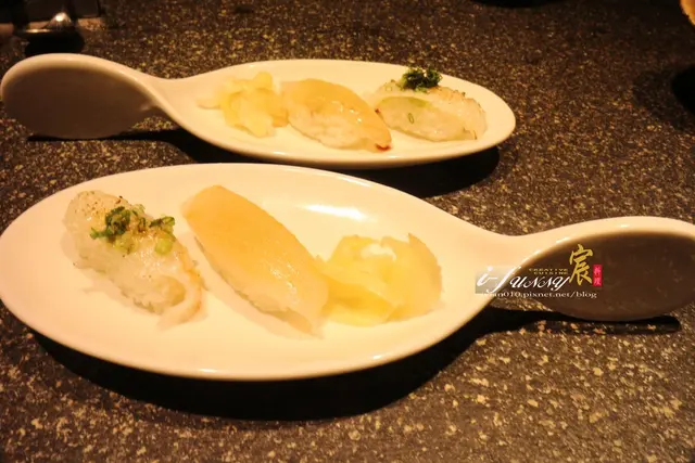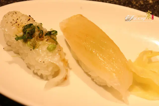左為炙燒比目魚鰭邊肉,入口即化在口中油化效果極佳,右為馬鞭魚,可能是吃的順序有誤,魚肉的鮮甜度表現較不明顯。