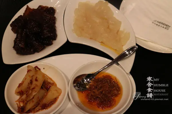 開胃小菜有四種,由左上順時針依序為涼拌魚皮,涼拌苦瓜、XO醬、醃製薑片。