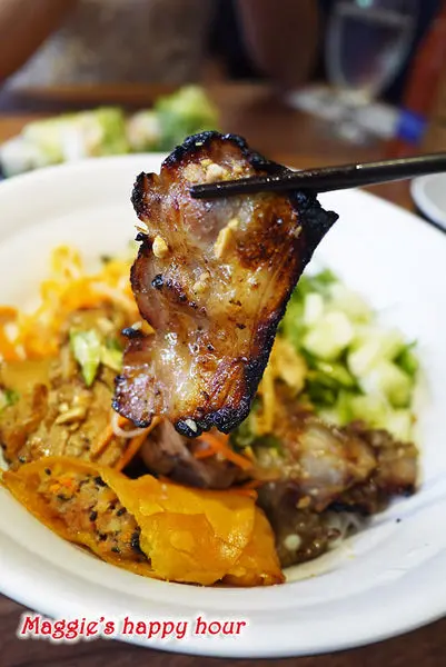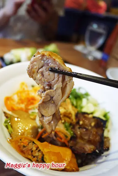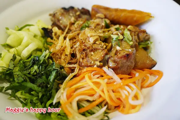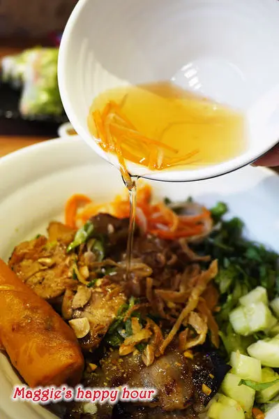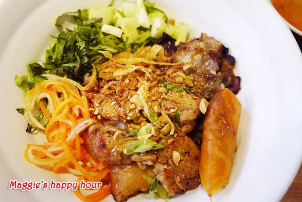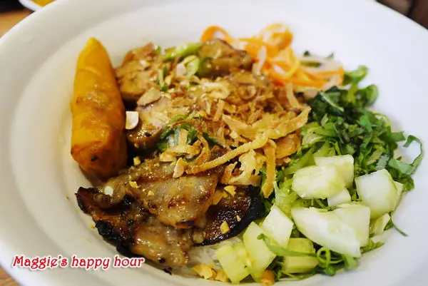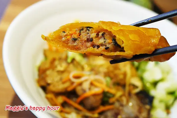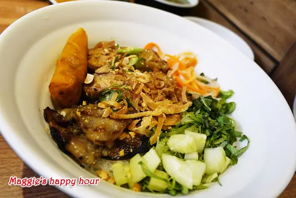 檬(米線)是我點的另一道主食,以往吃過的越南菜好像都點河粉,天氣熱想換點清爽的米線來品嚐,這道檬(米線)上頭舖滿配菜和佐料十分豐富,配菜我選了QQ雞和BBQ豬雙併,搭配了紅蘿蔔絲、青木瓜絲、香菜、大黃瓜和半條炸春捲,最後灑上點蔥花和提升口感的花生米就大功告成了。