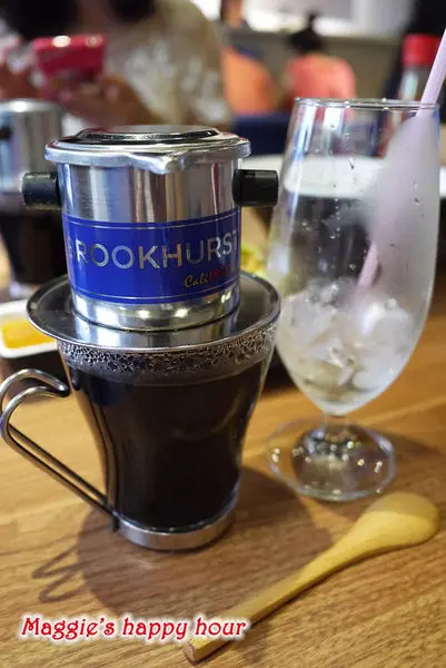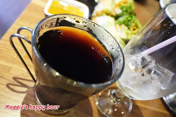 飲料的部份我們都點了BH咖啡,冷熱各一杯,這裡的咖啡是用咖啡粉加在容器中再加入熱水讓咖啡慢慢滴入杯中,越南咖啡的味道較濃在透明的杯中顏色看起來很深,喝起來口感香醇濃郁又不會太苦,我喝的是無糖冰咖啡選擇自己倒入杯中,店家會給一個空杯加入冰塊,我要求冰塊少一點,喝起來就比較像常溫的咖啡。