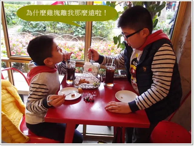 孩子自己坐一桌,大人坐一桌,他們吃的差不多的時後就自己去公園玩,