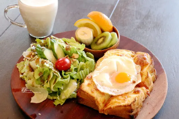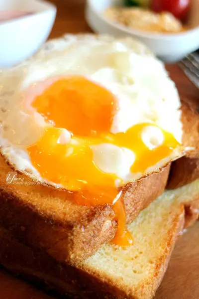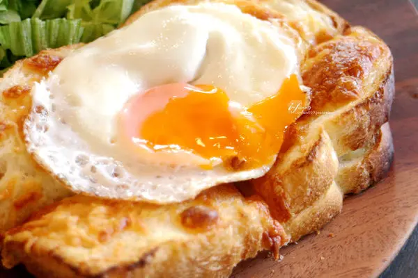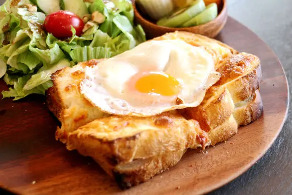 兩片吐司外層加上起司酥烤過,再加上一顆半熟蛋,若想要全熟蛋也可事先告知喔!