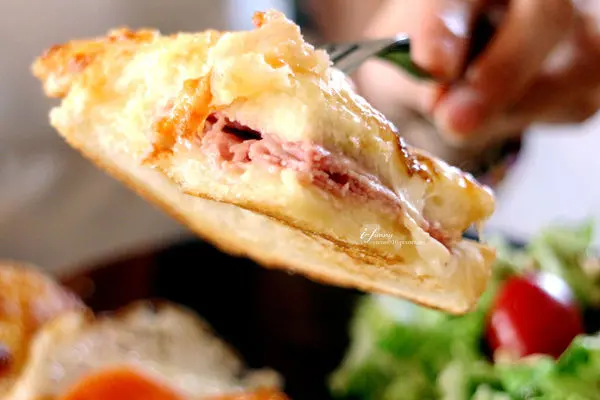 內層還夾入了滿滿的馬札瑞拉起司,與特殊風味的法國火腿,還有外表焗烤過的酥香,