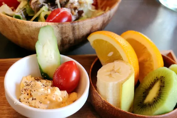 一小盆的水果中有柳橙、香蕉及奇異果。生菜沙拉還吃得到堅果碎粒的香氣。