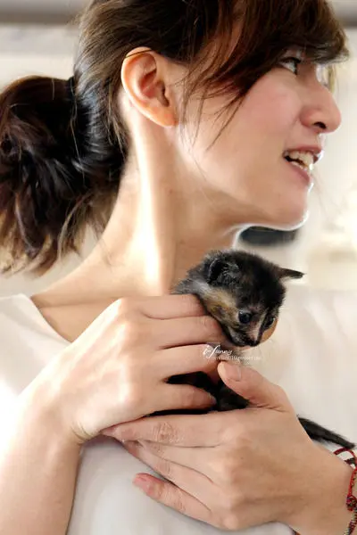 美麗的友人把牠懷抱著,深怕一不小心摔到了。