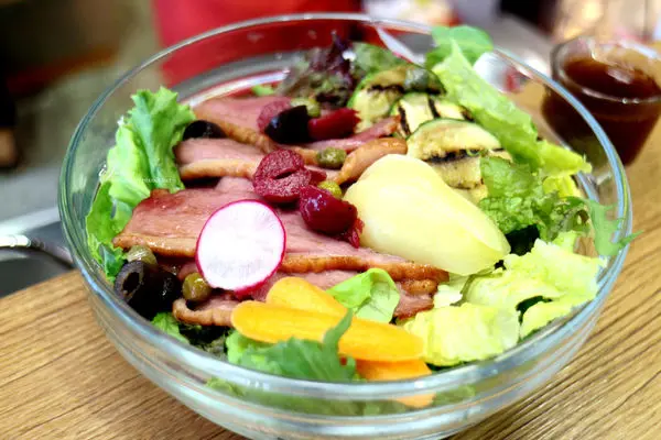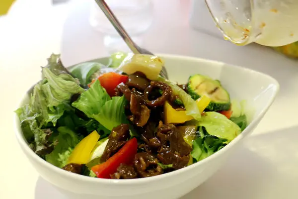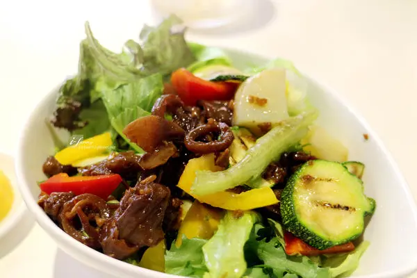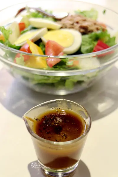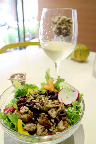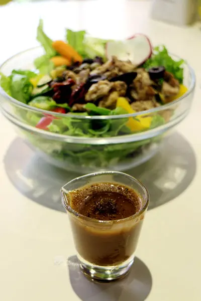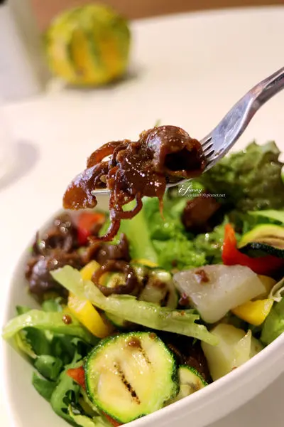 最令人回味的是以紅酒醋、蔓越莓水果醋及橄欖油調的醬汁,溫熱吃沙拉很有滋味。