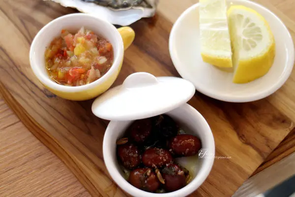 貼心地附上紅酒橄欖、莎莎醬及檸檬。橄欖特地去了籽,超下酒的!