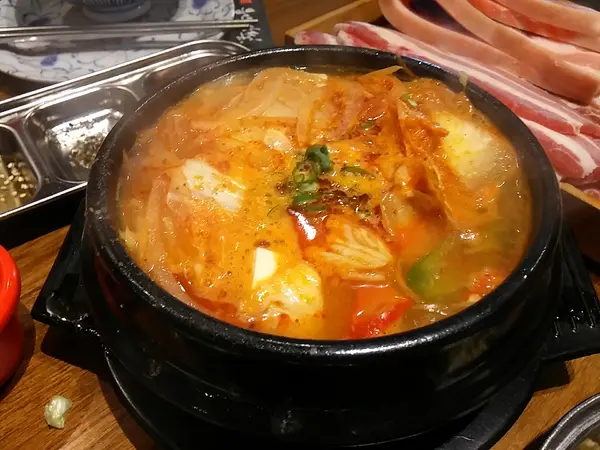 看起來很辣實際喝起來不會很辣及重鹹口味,裡面有豆腐、豬肉、泡菜、蛋、洋蔥、蔥花等