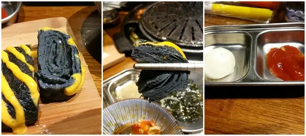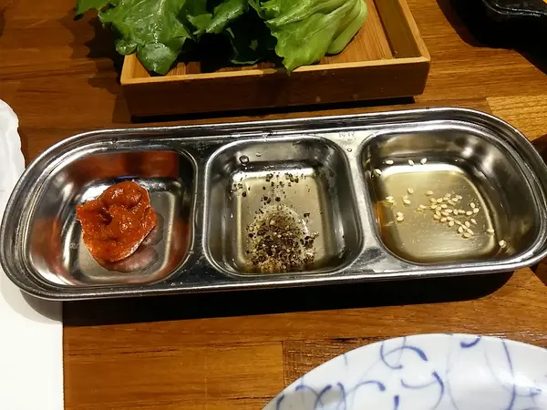 ▼ 沾醬 (左:韓式辣醬(我喜歡這個)、中:黑胡椒+海鹽(鹹鹹的)、右:特調沾醬(微甜))