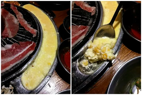 服務人員在銅盤凹槽地方放泡菜、豆芽菜 (這個好吃)、玉米粒+起司再淋上蛋汁