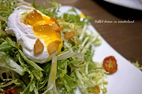 水波蛋輕輕劃開,黃澄澄的蛋液大肆流出