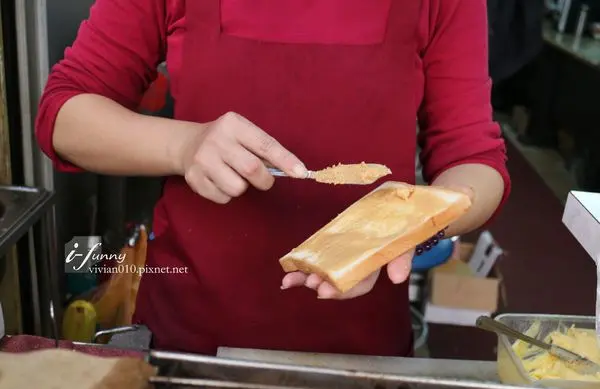 烤好的吐司,阿姐會將三片吐司分別塗上奶油、花生醬及美乃滋。