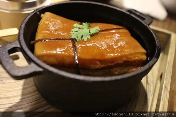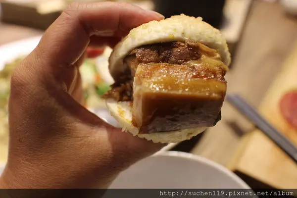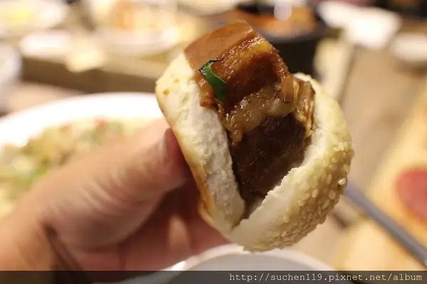 把東坡肉夾在已事先對切的鹹光餅上來享用