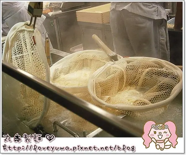 釜揚烏龍麵是師傅這樣現煮之後用帶網勺子馬上現撈進木碗之中而成。