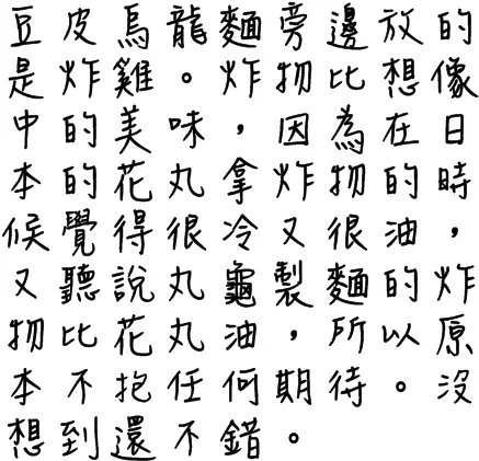 丸龜製麵的麵條還算滿Q的,不過也沒有到讓人驚艷的地步,沒吃過日本的不知道怎麼樣。