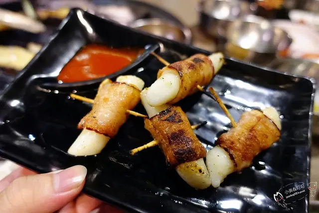 年糕配培根!蹦出新滋味~再沾點韓式辣醬,風味更特別!不過辣醬不會辣耶?鹹甜鹹甜的滋味