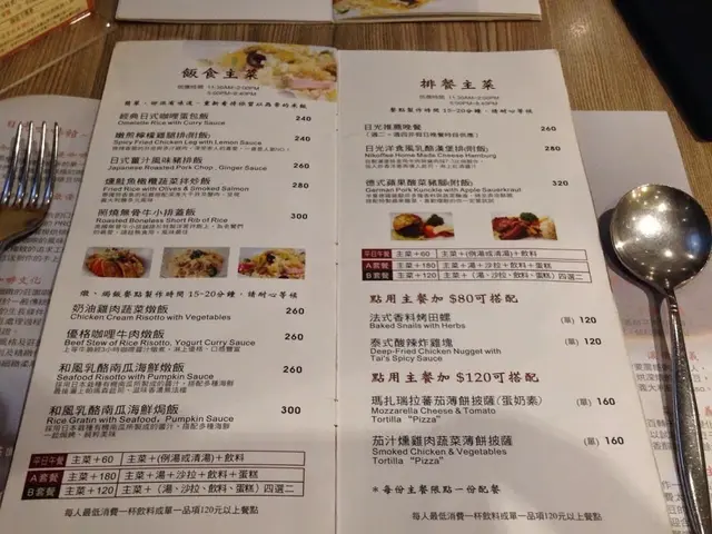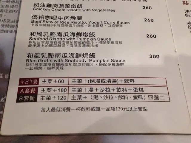 餐點方式是每個人最低消費一杯飲料或是單一品項120元以上的餐點,也可選擇主餐加價升級成套餐。