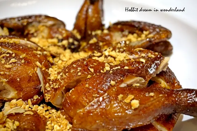 所以吃到很明顯的蒜頭香氣不是因為上方的蒜酥,而是香料透進雞裡面進而散發出來的香