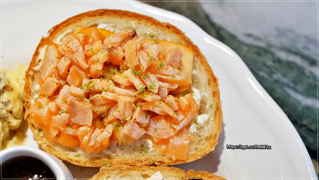 將鮭魚切成碎丁,跟麵包搭著吃更加美味