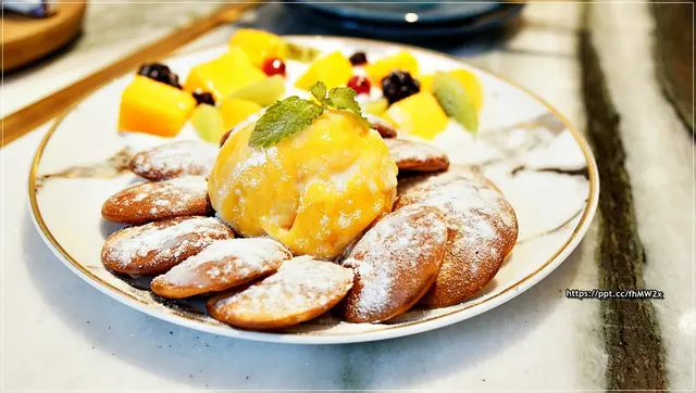最佳吃法就是將荷蘭小鬆餅,沾著芒果冰淇淋跟鮮奶油一起吃