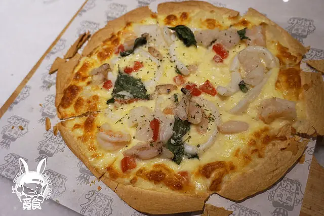 有花枝 蝦仁以及蟹肉 搭配蘿勒跟番茄 還有少不了的起司