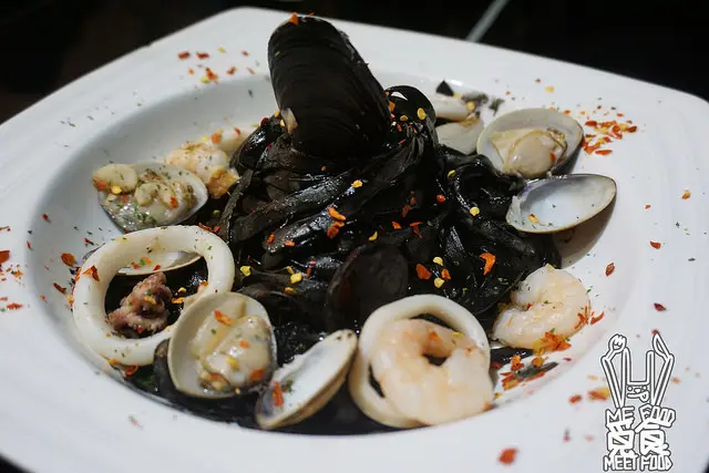 烏蘇拉總匯海鮮細扁麵是以墨魚醬汁為底的義大利麵