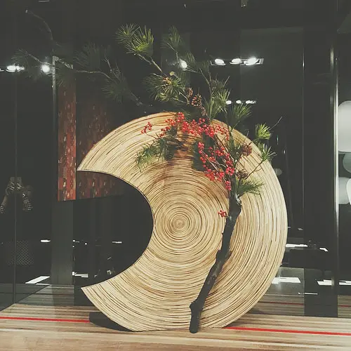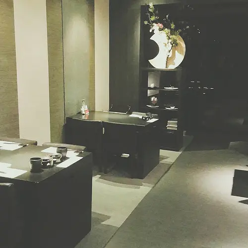 到位置上坐定之後,我們倆早餓壞了,立刻點好了餐點,便開始環顧店內環境。幸好我們提早到,應該是晚餐時間的第一組客人吧,空蕩蕩的正好讓我們好好的記錄下室內空間。隨處可見改良式的壁龕,擺放著典雅的各式裝飾品;幾面牆上還掛上了和服布料的擺設,非常高貴且具現代感,並且不失去日式料理所想傳達的氛圍。
