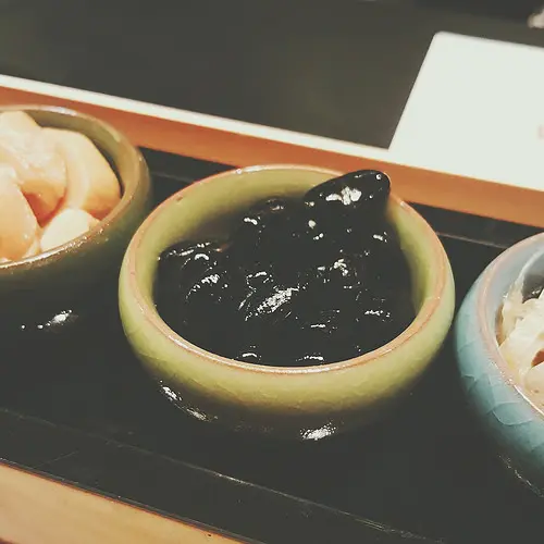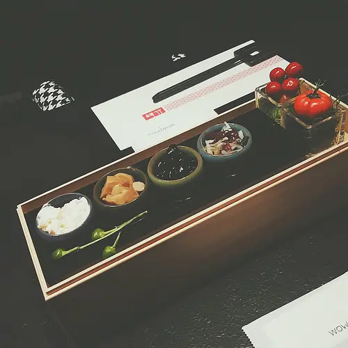 這時候服務人員上桌了一個木盒子,說是在主要套餐上來前,這是主廚都會招待的一個前菜,由右至左分別是海藻醋物、黑豆、杏鮑菇和北歐沙拉,建議依照口味濃淡從右至左吃起。