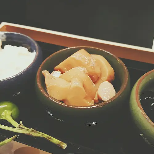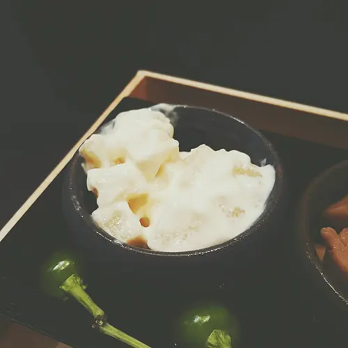 在容器裡放上了燒熱的石子,上桌時服務人員會先將酒粕淋上熗過,霎時間酒香四起非常吸引人。而豬肉本身肉質口感依然保有一定品質,調味類似照燒醬,帶著些許甜味,香氣十足,但口味比較沒有太特別之處。