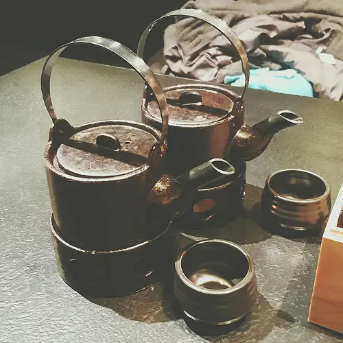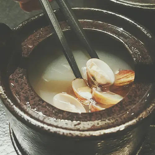看起來像是裝著熱茶的茶壺還附上茶杯,殊不知掀開蓋子一看,原來是盛裝著滿滿蜆仔的蒜味蜆湯。湯頭非常鮮甜,淡淡的蒜頭味道提味,不特別喜歡蒜頭味道的應該也可以接受,天冷的這時恰好暖和身子也暖暖胃。下方有蠟燭(酒精膏?)加熱,即便慢慢品嚐也不怕放到涼掉。