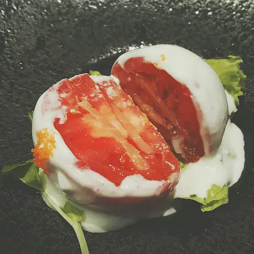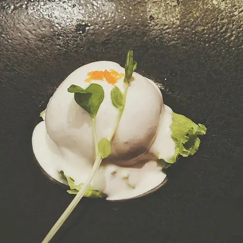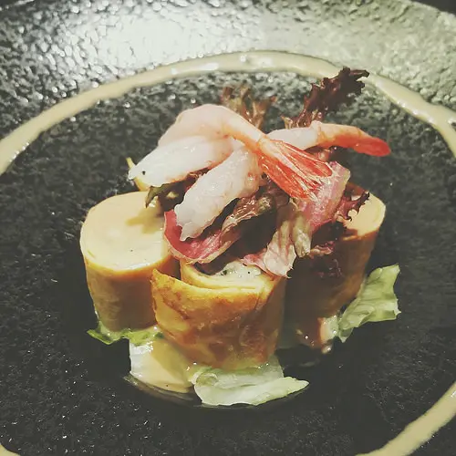 是以蛋皮包裹住菠菜,放上甜蝦後再佐以胡麻醬。口感層次豐富,且胡麻醬味道帶甜香氣飽足,將時蔬捲本身的食材味道襯托得恰好;也很不錯,不過蕃茄燻鮭魚沙拉表現較亮眼,所以甜蝦時蔬捲相對就顯得不那麼出色了。