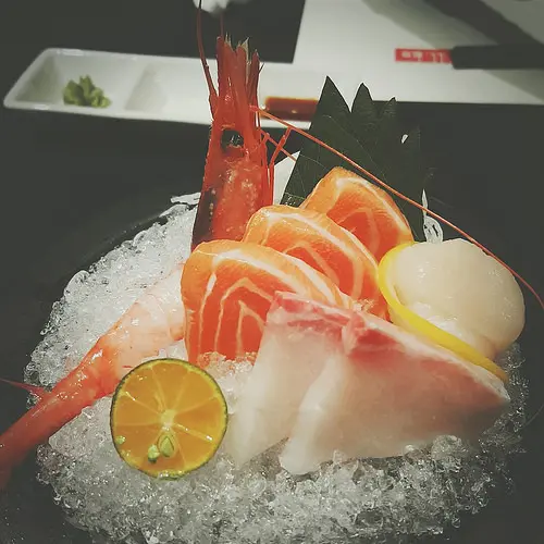 接著上桌的,裡頭包含了甜蝦、干貝、鮭魚和海鱺魚,魚肉本身處理得宜沒有腥味,尤其干貝和海鱺魚還帶著海鮮的甜味。