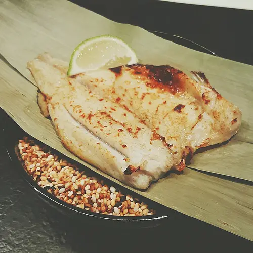 的魚肉本身保持著彈牙口感,而底下盛裝的石板上頭,還放著一片粽葉,在吃進魚肉之前就能聞到粽葉獨有的清香味,讓容易吃來無趣的一夜干變得意猶未盡。