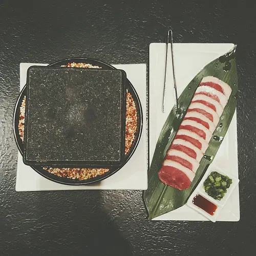 一樣是加熱的石板,在底下添了酒精膏火,就直接在上頭烤囉!