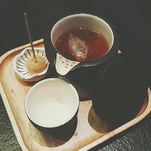 至於,一樣精緻的茶具,一上桌來便隨即聞到了濃濃的薄荷香氣,這才想起在一開始坐下時,已經先附上了暖身子的玄米茶也非常好喝。在餐後都有去油解膩的功用,另外還附上了一塊麻糬茶點,為今天的美好用餐經驗畫下完美句點。