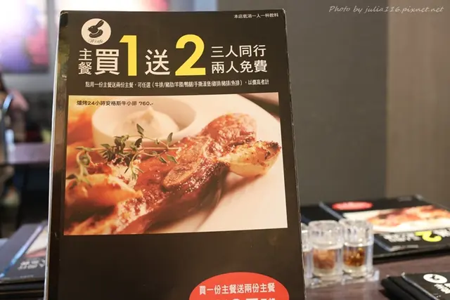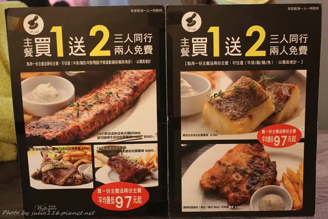 特別注意,上面右邊的排餐單價比較高(主廚精選最貴$990),贈送的範圍只能是前面幾頁的餐點喔