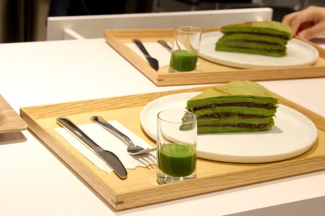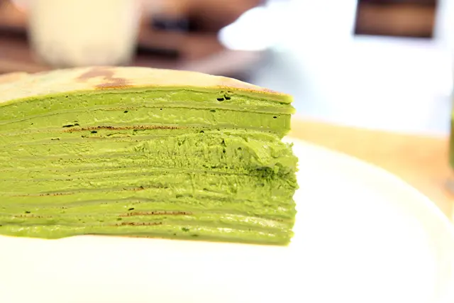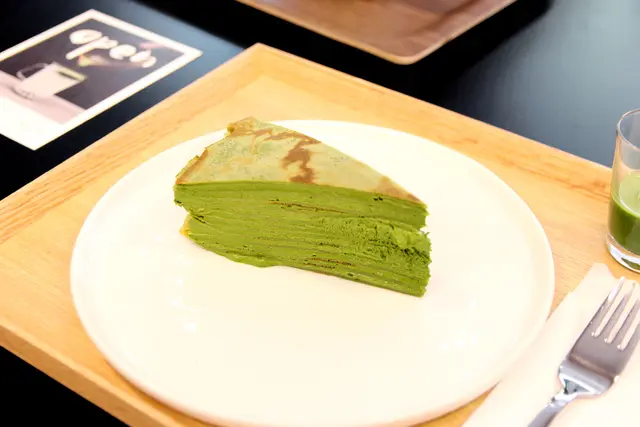 先嚐一口未淋上抹茶糖漿的千層來試試,